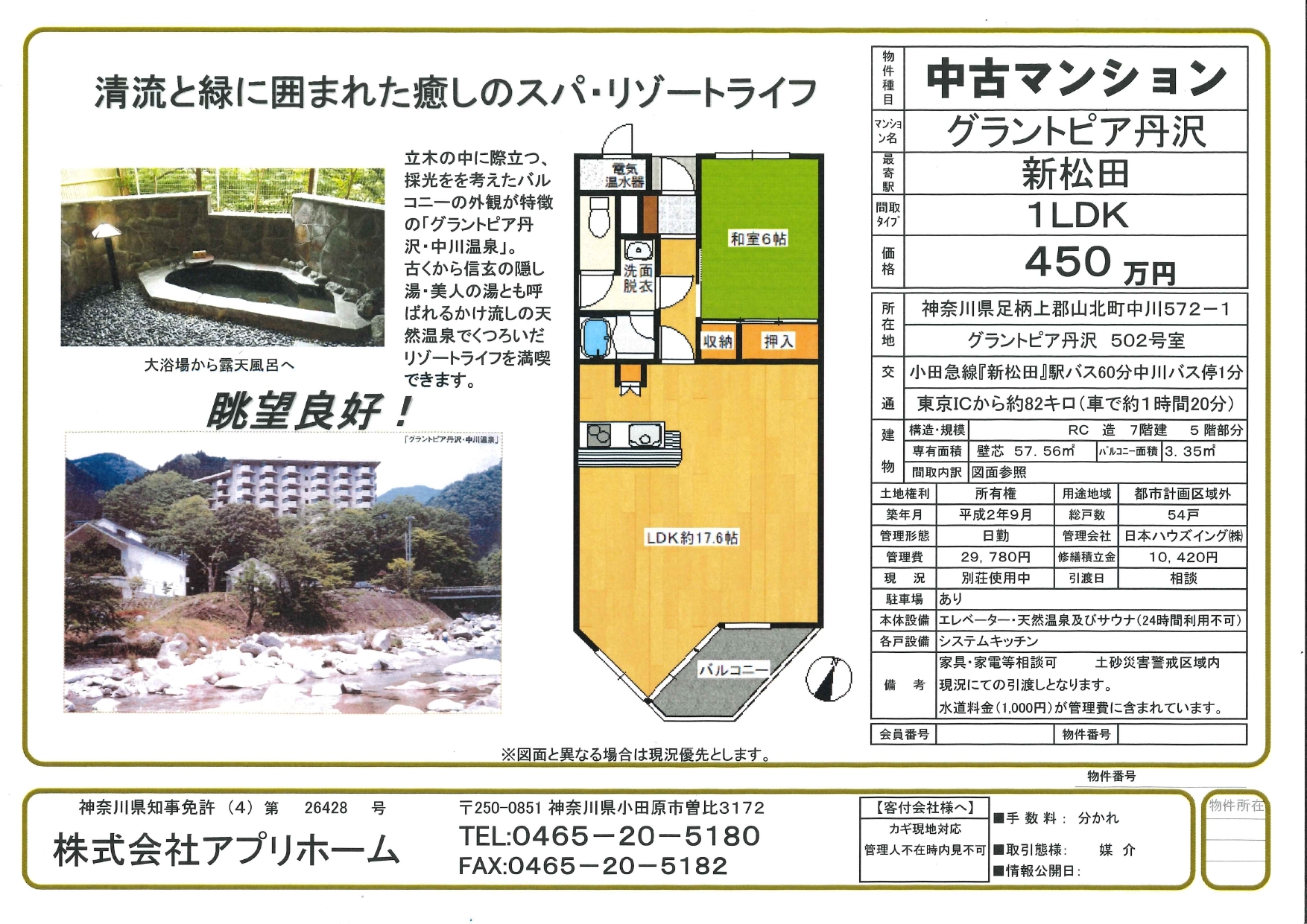 ・設備:公共上下水道・東京電力・共用サウナ・共用露天風呂・共用温泉浴場2ヶ所