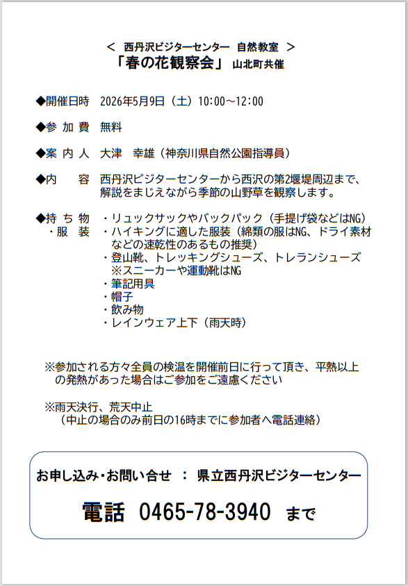 西丹沢ビジターセンター周辺を散策しながら季節の山野草を一緒に観察しましょう♪