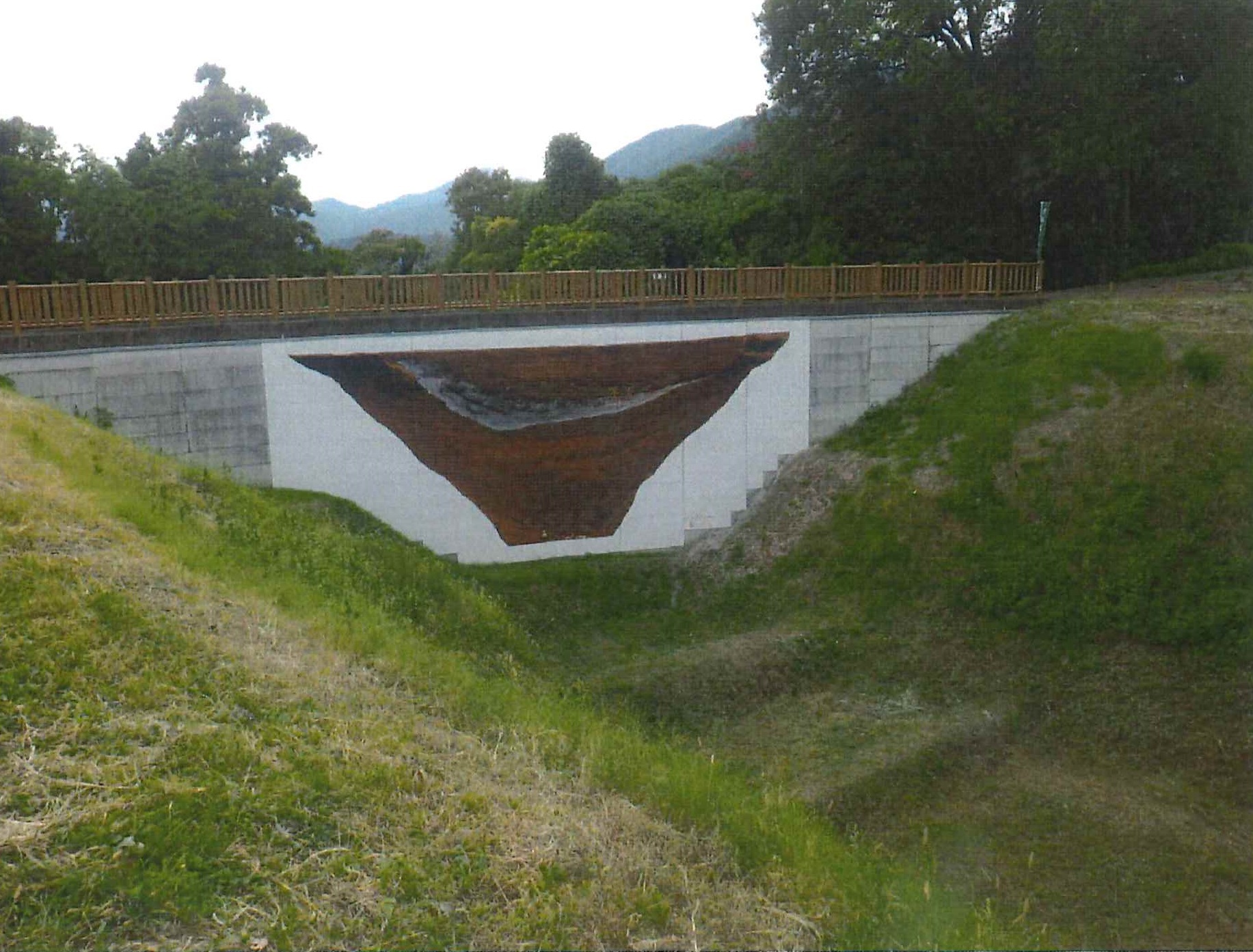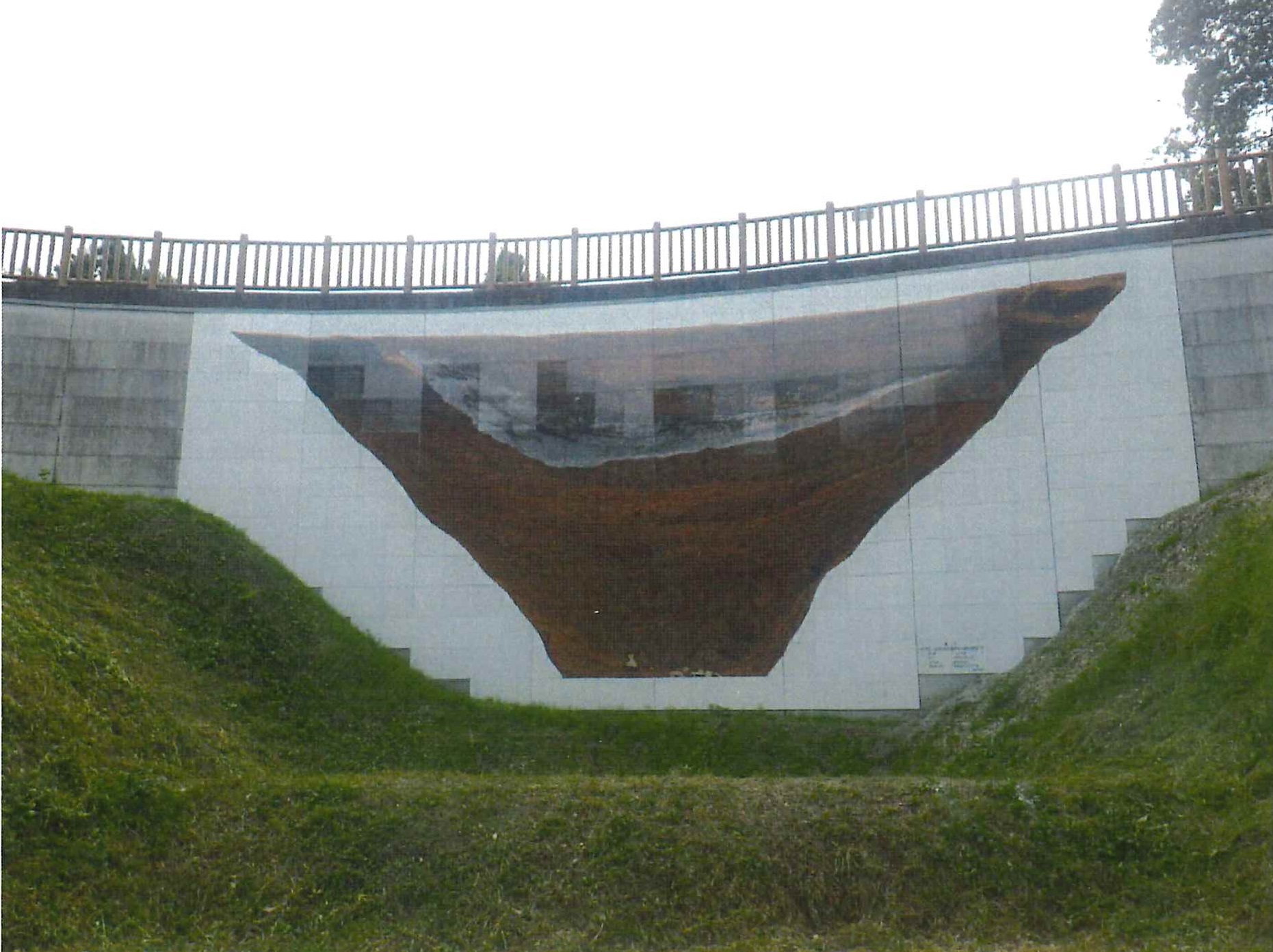 河村城跡の堀切2において管理用道路を兼ねた土橋壁面に発掘調査時の土層断面図を展示することで、