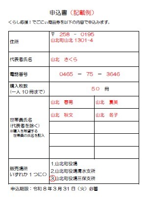 ※山北町役場での購入希望者が多いことが予想され、山北町役場を希望される方の購入引換券の発送は時間がかかる場合がございます。購入場所の分散にご協力ください。