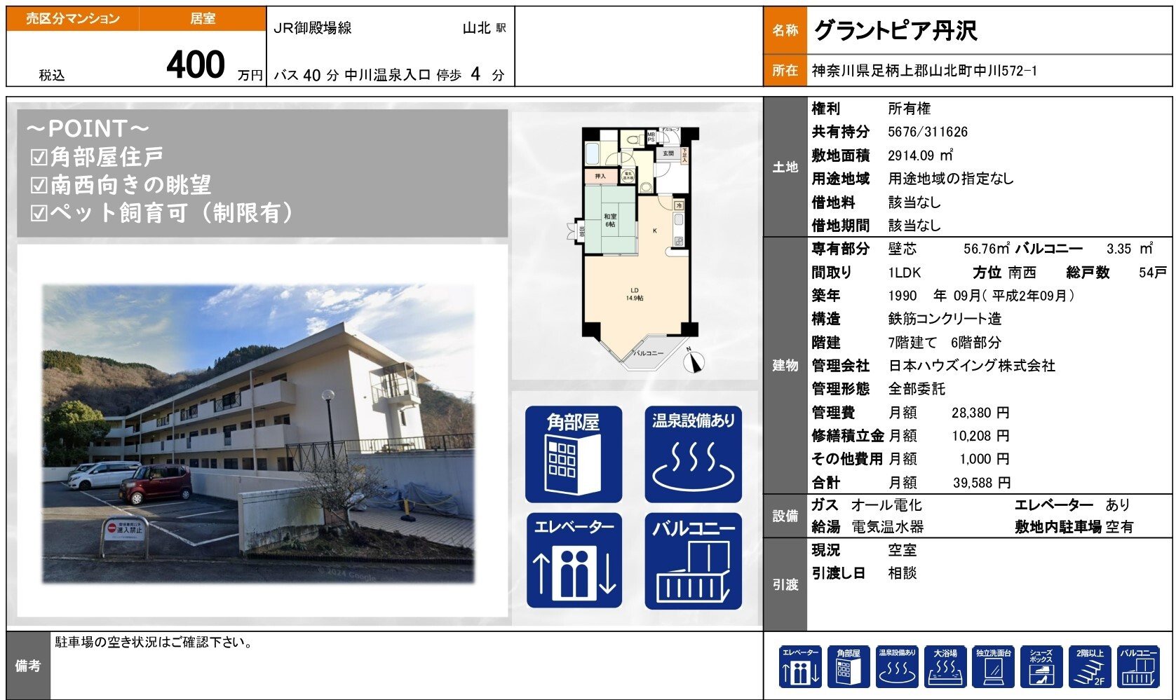 ・設備:公共上下水道・オール電化(東京電力)・共用サウナ・共用露天風呂・共用温泉浴場2ヶ所