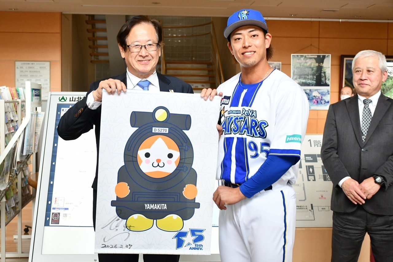表敬訪問当日は、山北町への感謝の気持ちと、これからも横浜DeNAベイスターズを引き続き応援し続けてほしいという願いを込めたご挨拶いただき、ご当地スターマンが描かれたタペストリーを贈呈いただきました。