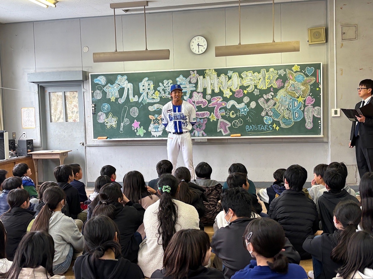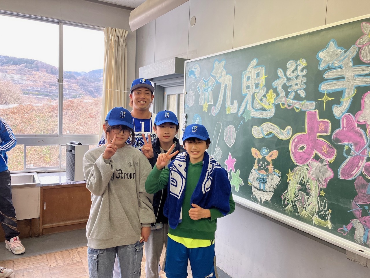 九鬼選手が川村小学校を訪問し、川村小学校の児童へベースボールキャップの贈呈が行われました。