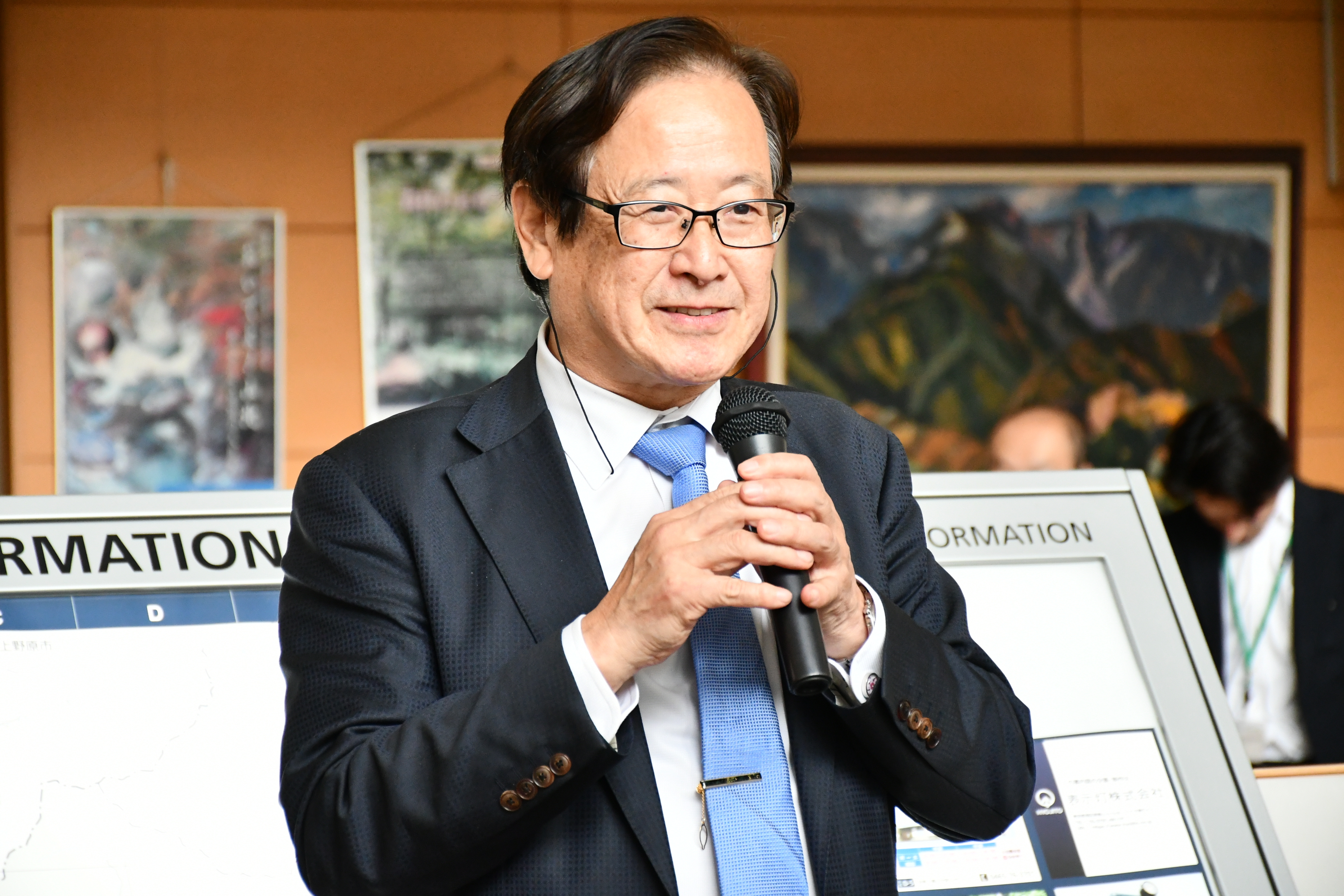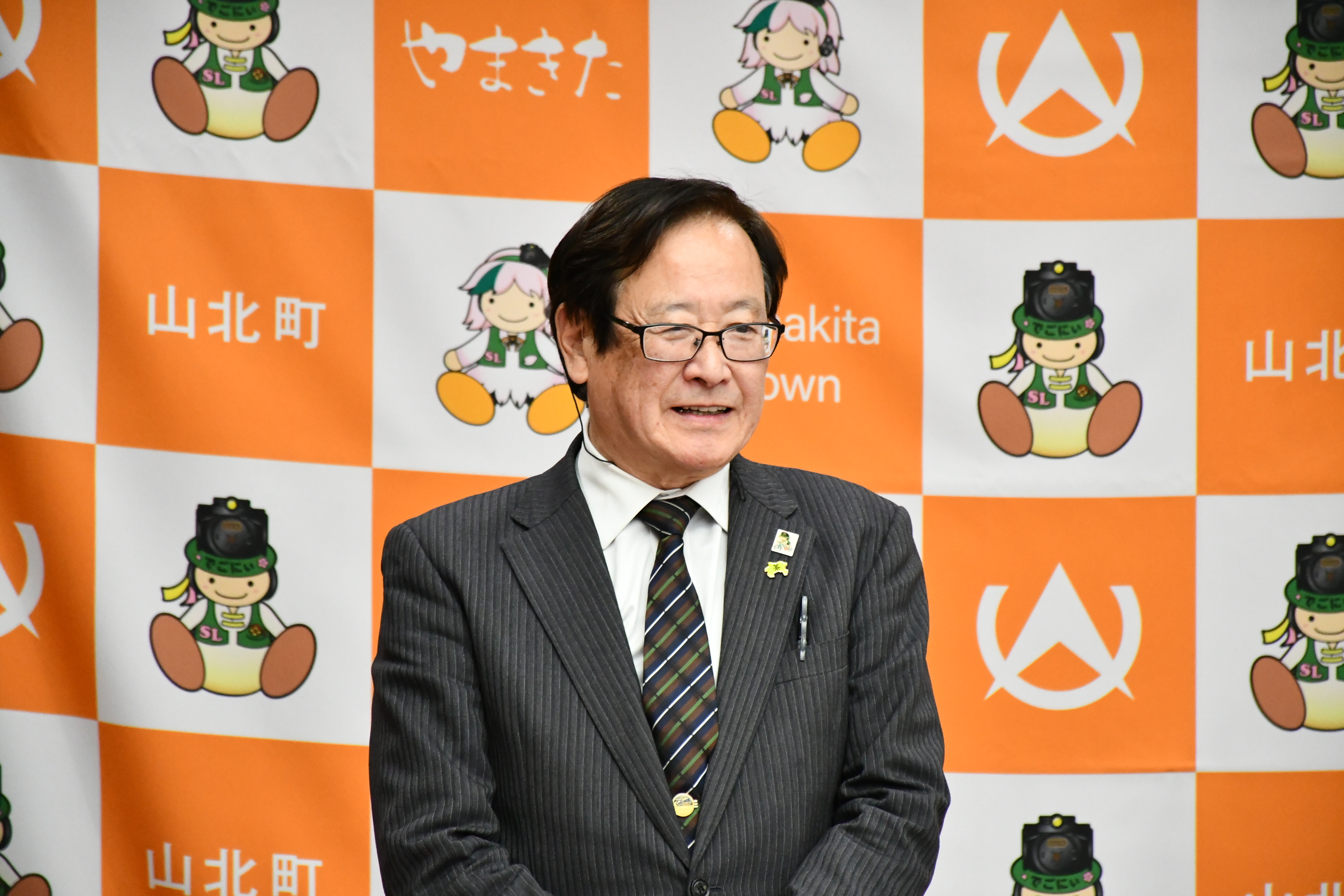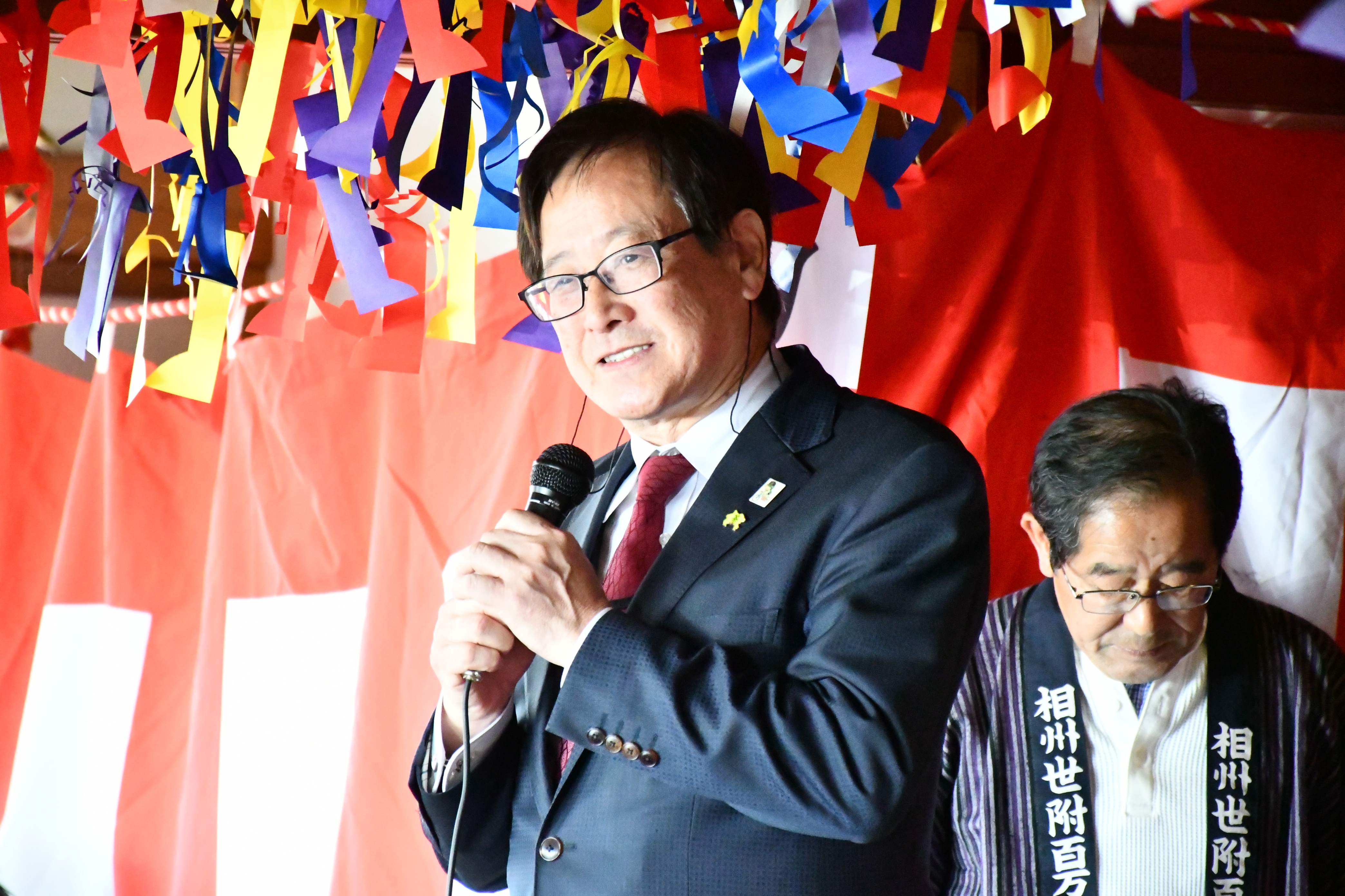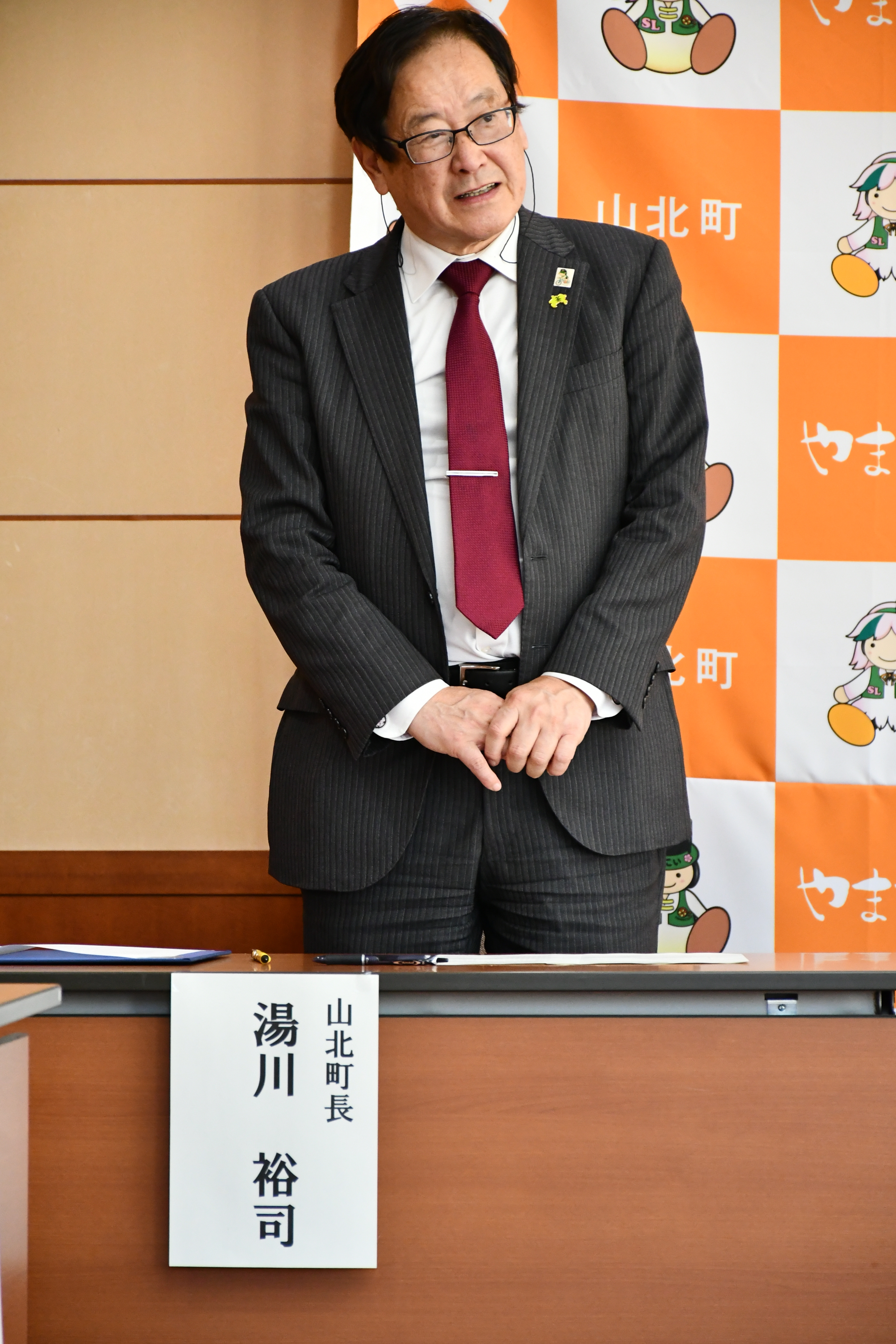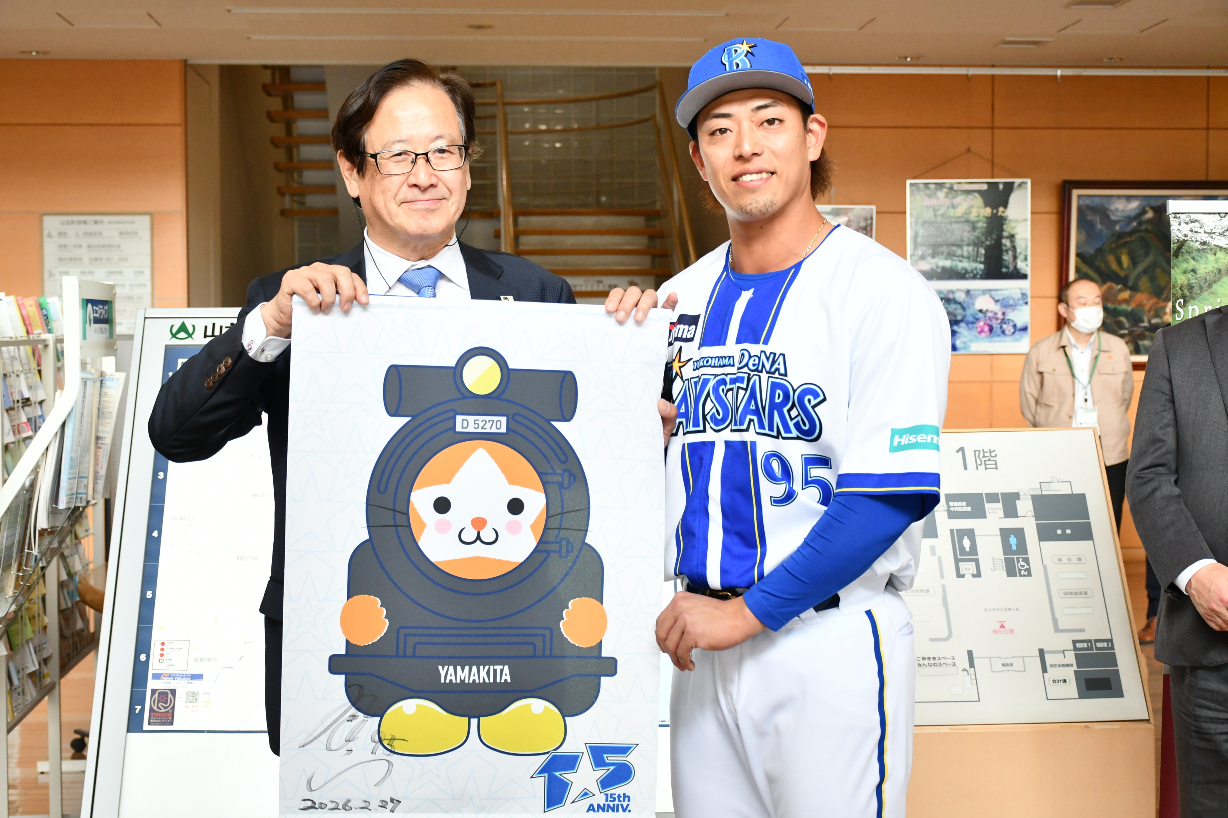 山北町への感謝の気持ちと、これからも横浜DeNAベイスターズを引き続き応援し続けてほしいという願いを込めたご挨拶いただき、ご当地スターマンが描かれたタペストリーを贈呈いただきました。