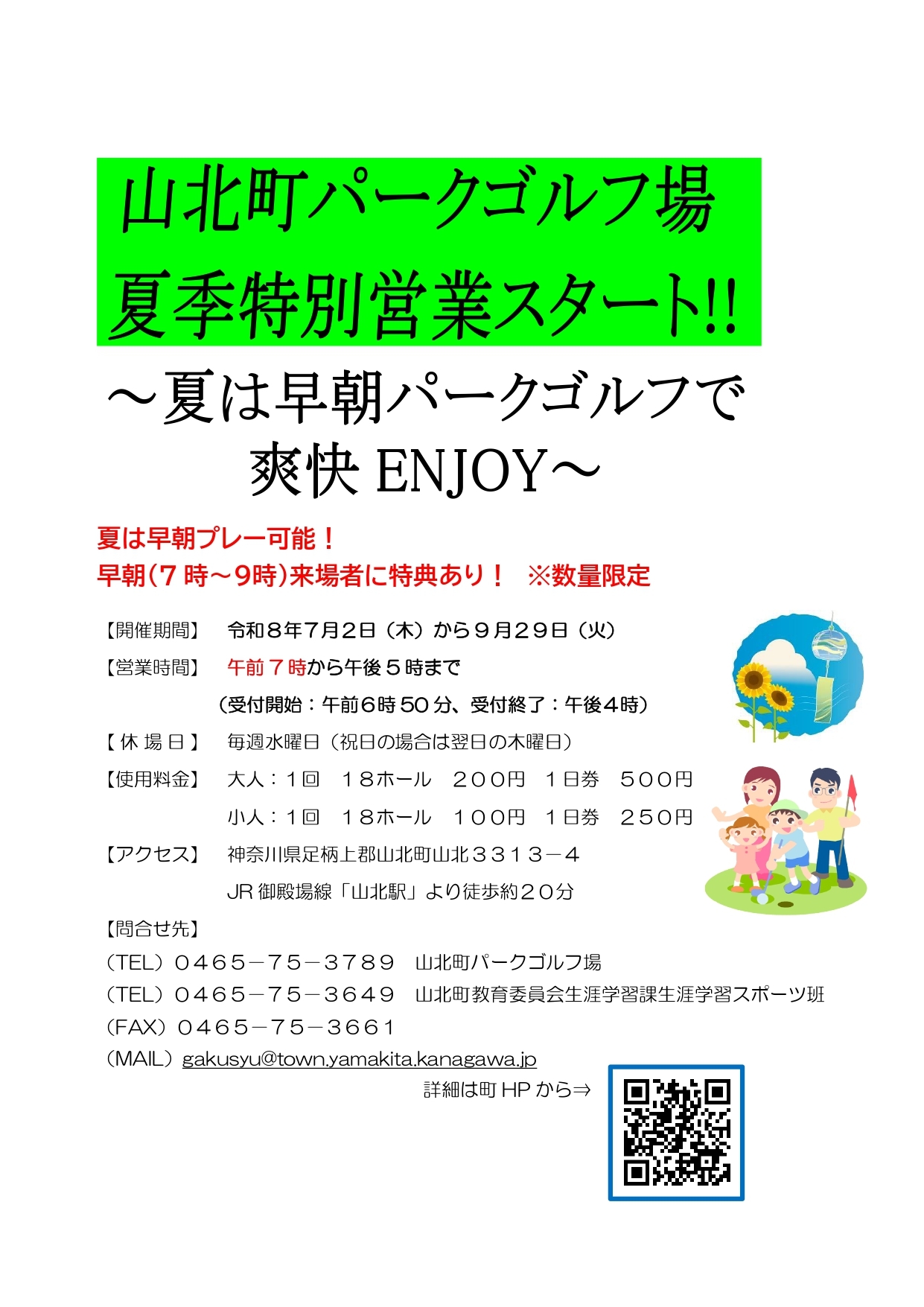 山北町パークゴルフ場では、夏場の猛暑の影響を避ける取り組みとして7月から9月までの期間、開始時刻を7時へ変更した夏季特別営業を実施します。